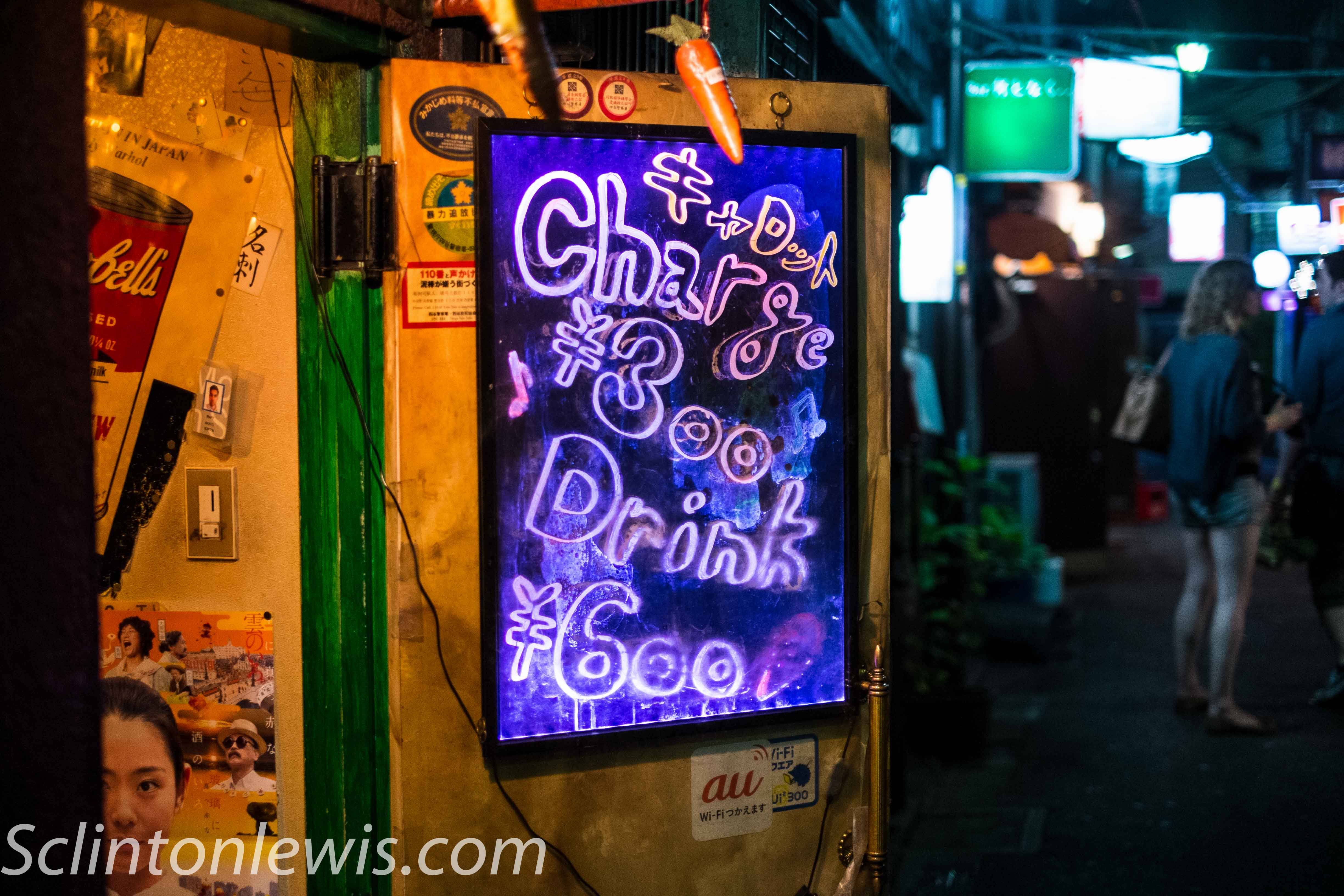 So walking around in Shinjuku after we went to the robot Show we checked out Golden Gai which is an area of small bars and narrow alley ways. Lots of interesting themed bars and a lot of the places don’t allow any photograph as they have signs all over the place probably because of tourists going inside and just taking pictures or some other past problem. People go in an hang loose. I wish I spent more time walking around or even went in to drink at a place. It started to rain on us and that was the only time it rained on our trip which was fortunate for us. These places, actually a lot of bars or clubs, have a cover charge to go in or occupy a table and then you buy what ever they have.